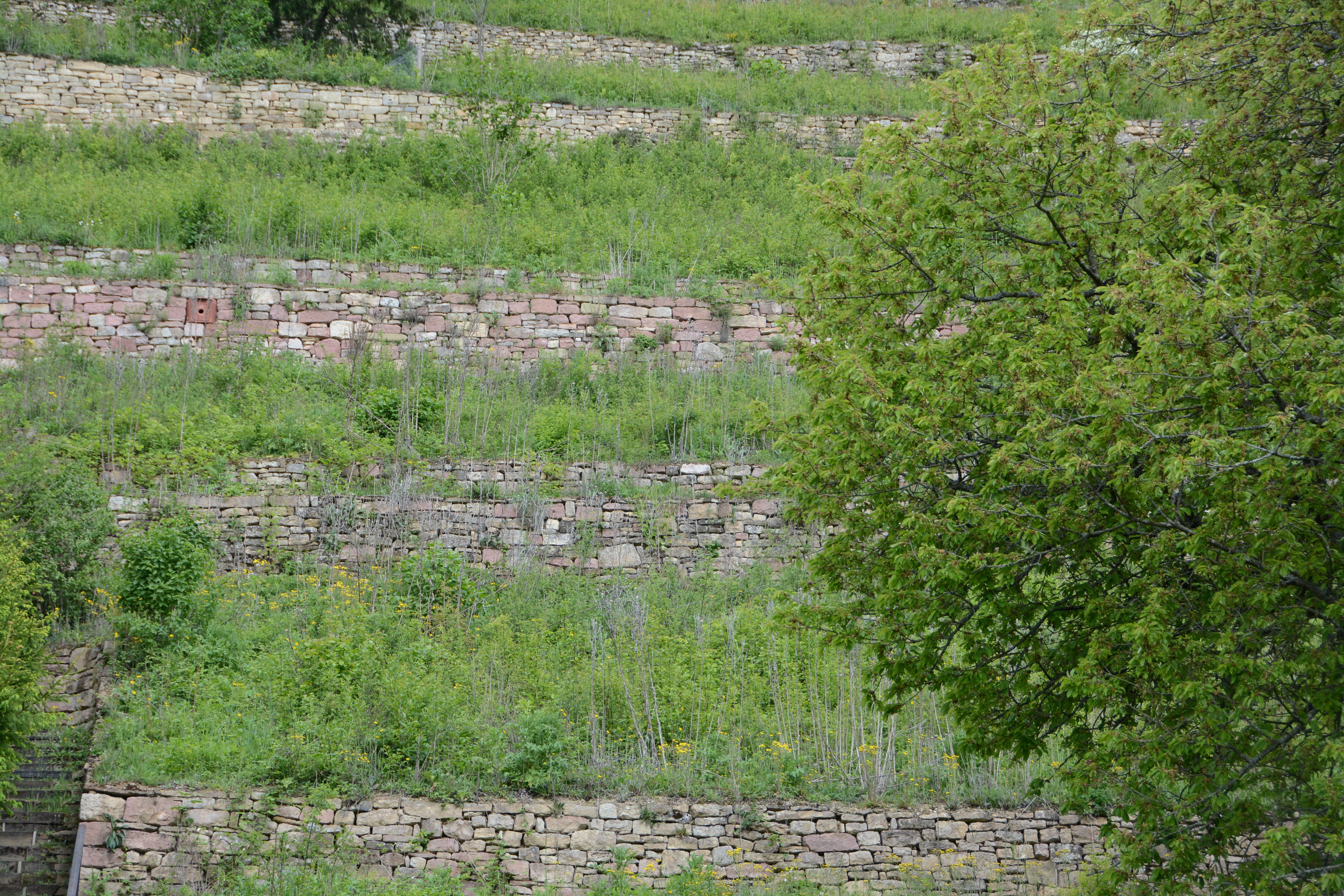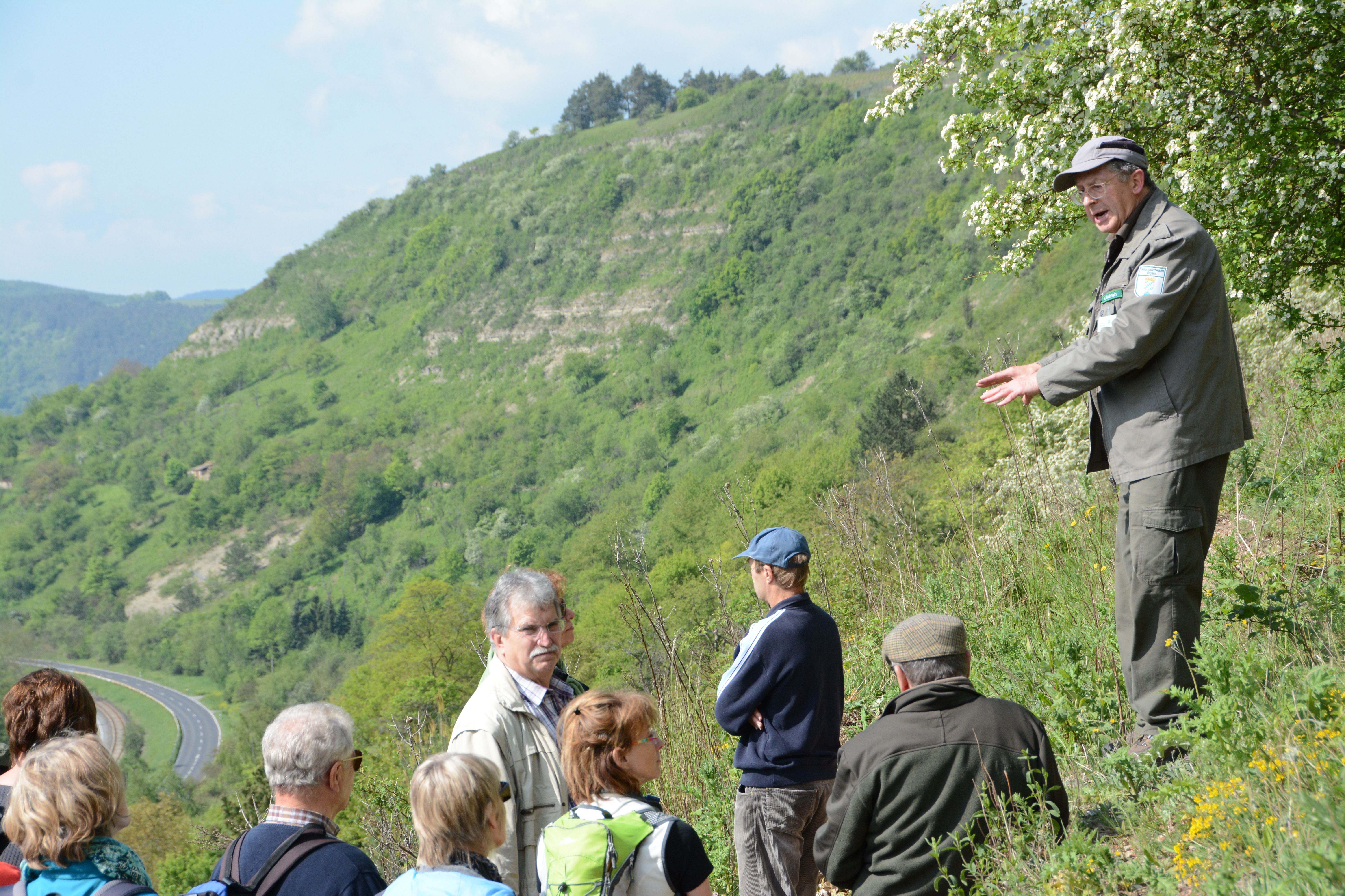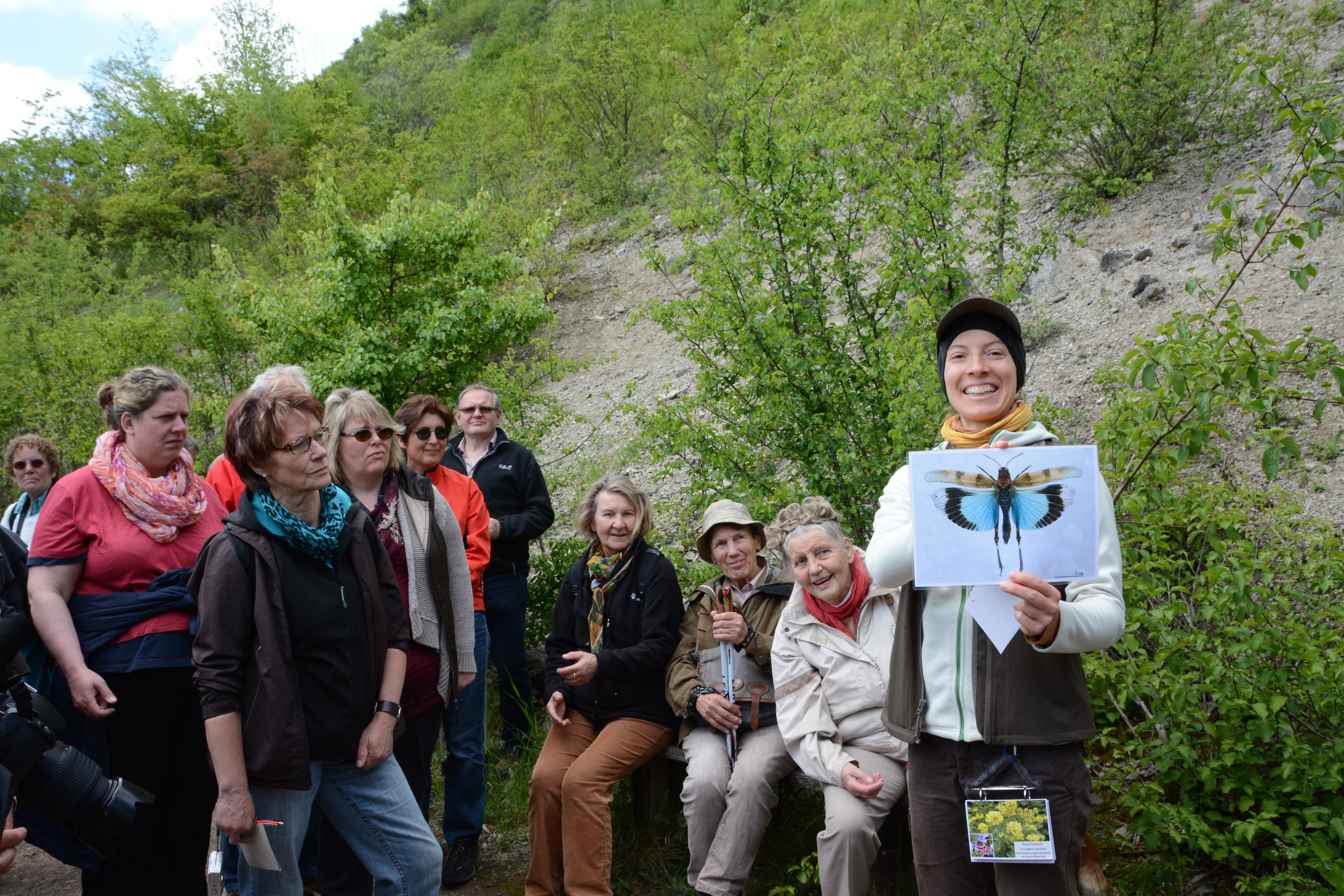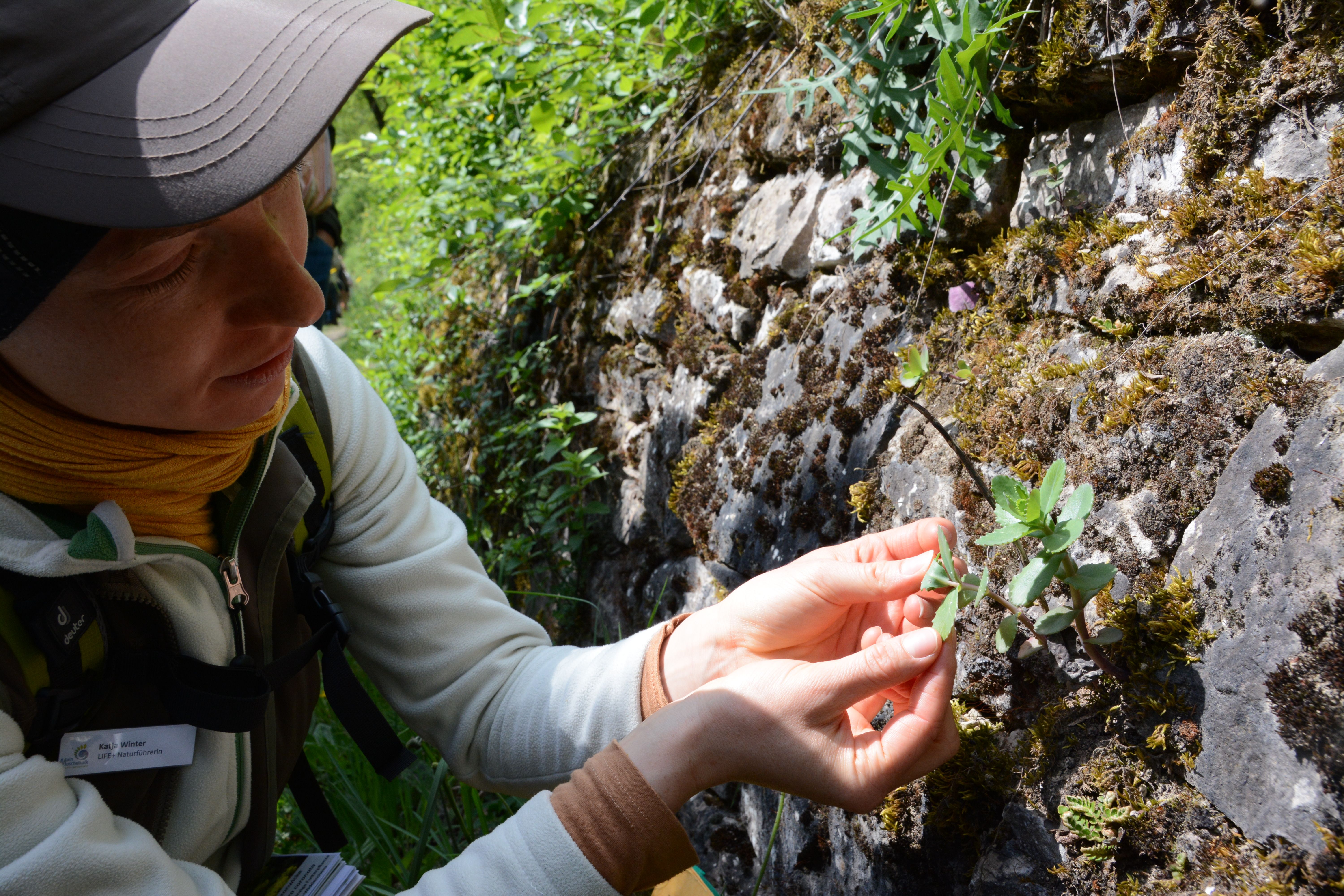 Friedrich Mährlein erklärt die Besonderheiten des kargen, steilen Hammelberges Restaurierte Weinbergsmauern der seltene Fetthennenbläuling findet hier noch einen Lebensraum Die Fetthenne wächst an alten Weinbergsmauern Einzeln abgelegte, helle Eier des Fettlhennenbläulings auf der Fetthenne Katja Winter zeigt Foto von Blauflügeliger Ödlandschrecke, die auch am Hammelberg zu finden ist Wichtige Helfer beim Erhalt aufgelassener Kulturlandschaft: die Ziegen