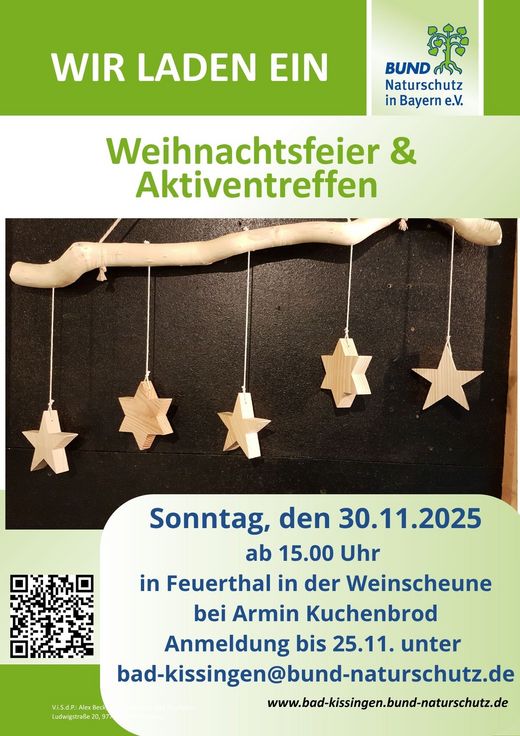 Das Jahr neigt sich dem Ende, die Planungen für 2026 sind in vollem Gange. Wir laden zu einer besinnlichen Runde von Naturinteressierten ein. Aus organisatorischen Gründen bitten wir auch hier um eine Anmeldung bis zum 25.11. unter bad-kissingen@bund-naturschutz.de Wie jedes Jahr freuen wir uns über Kuchenspenden!