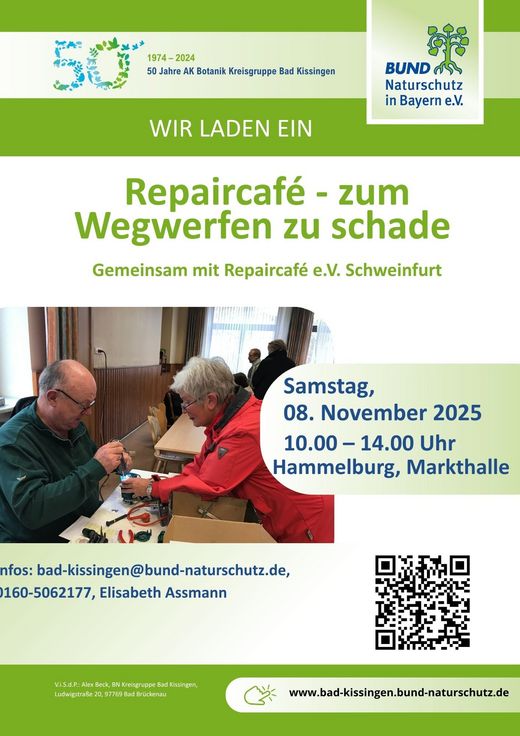 Am 8.11. in Hammelburg findet in Hammelburg in der Markthalle ein Repaircafe statt von 10.00-14.00. Eine Nähmaschine steht bereit, wenn kleinere Arbeiten selbst durchgeführt werden sollen. Für Kuchen und Kaffee wird noch ein/e KuchenspenderIn bzw. ein/e HelferIn vor Ort gesucht.