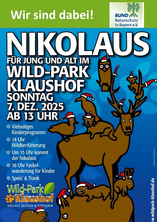 Wir freuen uns mit den großen und kleinen Besuchern des Wildparks auf den Nikolaus. An unserem Infostand gibt es wie immer auch etwas zu basteln. Da uns letztest Jahr die Basteleien wie warme Semmeln weggingen, freuen wir uns auch über alle, die uns beim Basteln und Informieren unterstützen.
