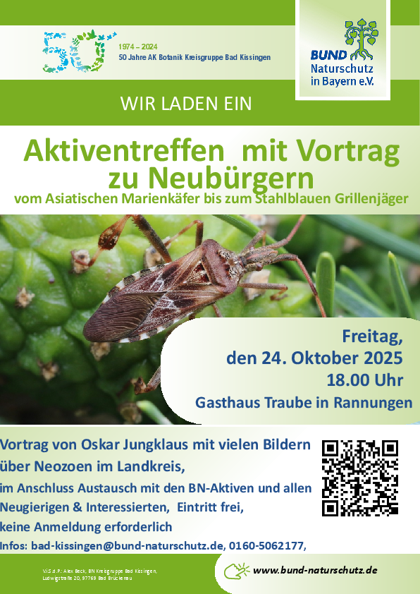 Die Kreisgruppe Bad Kissingen lädt zu einem Treffen für BN-Aktive und Interessierte am Freitag, den 24.10.2025, um 18.00 Uhr in den Gasthof zur Traube in Rannungen ein. Zu Beginn zeigt Oskar Jungklaus Fotos von tierischen Neubürgern des Landkreises. Im Anschluss folgt der Bericht aus den verschiedenen Arbeitskreise. Im Vordergrund steht der Austausch untereinander und der einzelnen Arbeitskreise. Zu dem Treffen sind auch Nichtmitglieder willkommen. Wir freuen uns auf euch Vorstand und Geschäftsstelle